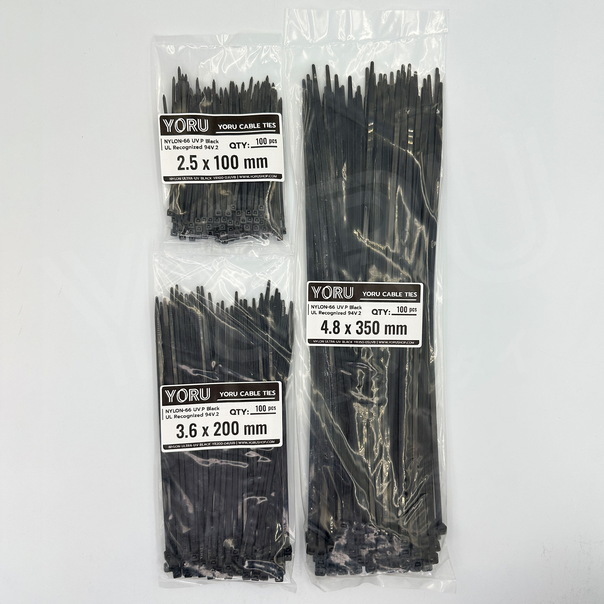 เคเบิ้ลไทร์ UV+ ยี่ห้อ YORU สีดำ (Black) เคเบิ้ลไทร์ทนความร้อนสูง (ชุด 100 เส้น) ราคาส่ง ยาว 4-14 นิ้ว สายเคเบิ้ลไทร์ทนแสง UV ผสมผงคาร์บอนสีดำพิเศษ ช่วยยืดอายุการใช้งานกลางแสงแดดได้นานกว่าสีดำแบบทั่วไป